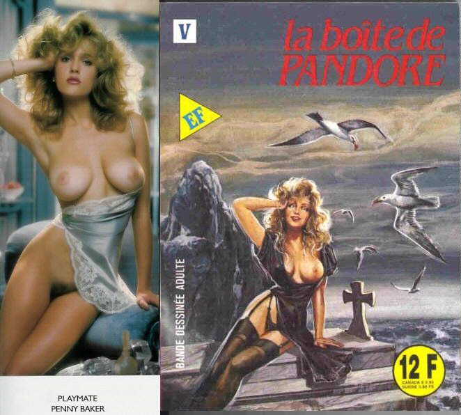Les dessinateurs des couvertures d'Elvifrance se sont inspirés sans doute de photos, d'images prises dans des revues et films de l'époque, etc. La couverture du no 23 La boîte de Pandore de la série violette (publication en 1990). Vous verrez l'étonnante ressemblance concernant le dessin de la femme sur la couverture avec la photo de la playmate de janvier 1984 Penny Baker. Sources: Martin Tremblay, Québec, Canada |
