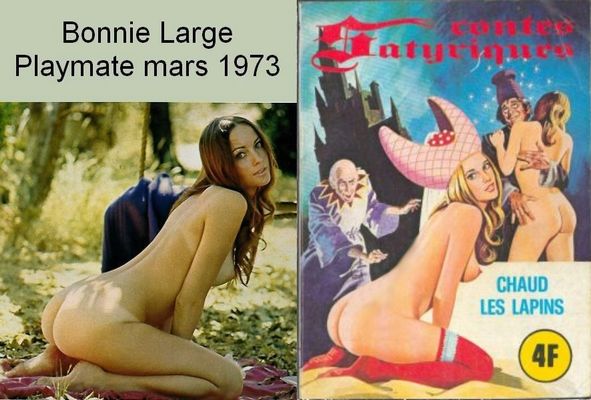 Les dessinateurs des couvertures d'Elvifrance se sont inspirés sans doute de photos, d'images prises dans des revues et films de l'époque, etc. Sur la couverture du Contes satyriques no 26, nous pouvons reconnaître la playmate Bonnie Large. Nous la retrouvons aussi sur la couverture no 134 de la série rouge. Sources: Martin Tremblay, Québec, Canada |