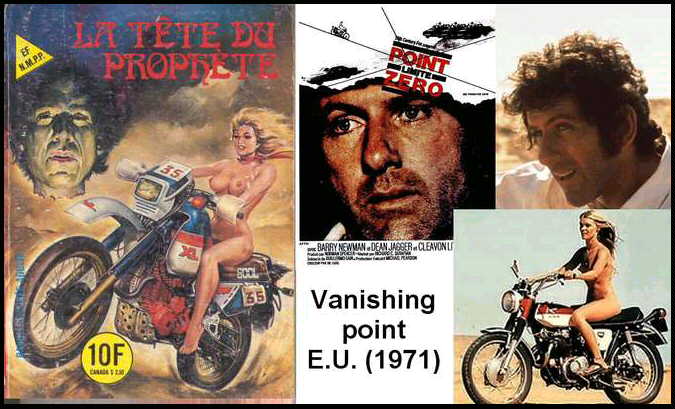 Les dessinateurs des couvertures d'Elvifrance se sont inspirés sans doute de photos, d'images prises dans des revues et films de l'époque, etc. Le dessinateur de la couverture no 147 de la série rouge semble avoir pris ses sources du film américain "Vanishing Point", en français "Point limite zéro" où nous retrouvons l'acteur principal Barry Newman et Gilda Texter se promenant nue sur une moto. Sources: Martin Tremblay, Québec, Canada |